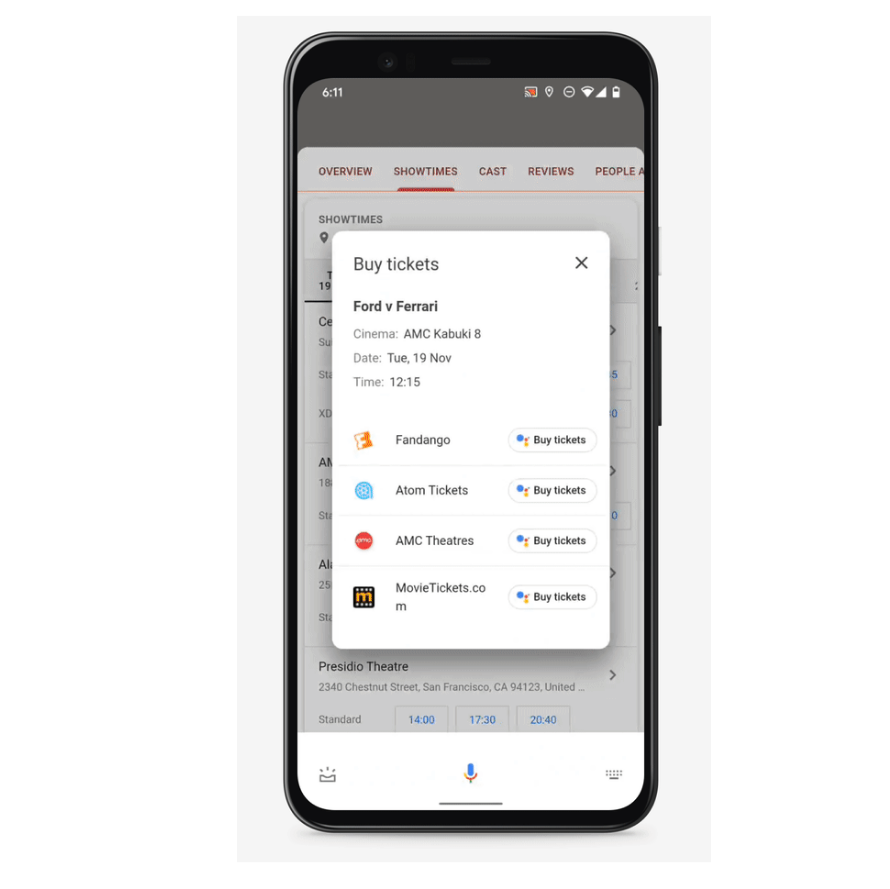 Après la sélection de séance, l’option « Achat de billets » oriente les internautes vers les pages de billetterie en ligne des exploitants participants, ainsi que vers Fandango ou Atom Tickets. Google Assistant guide les usagers à travers différentes options de paiement. L’intégration à Google Chrome offre une expérience d’achat plus rapide en permettant d’utiliser les informations de paiement déjà enregistrées dans le navigateur.