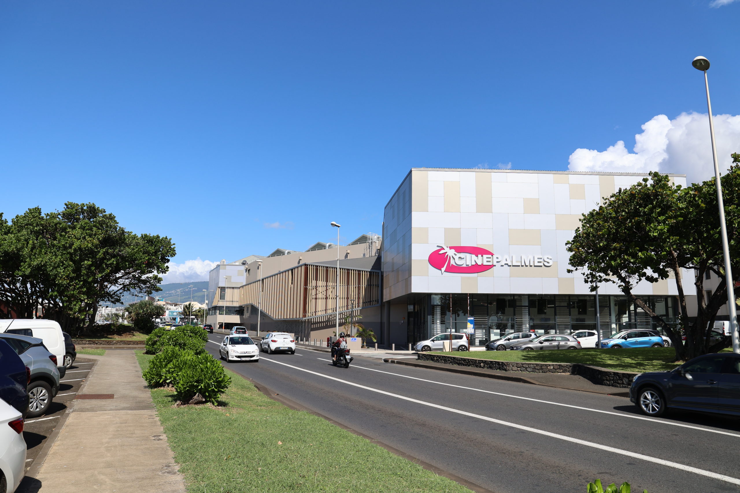 Implanté à quelques pas du littoral, dans la commune la plus septentrionale de La Réunion (Saint-Denis, 250 000 habitants), le nouveau Ciné Palmes se compose de deux boîtes recouvertes en aluminium avec des nuances tirant sur le bronze et le bleu. Elles sont reliées par un bâtiment plus tassé où a été agencée une zone de circulation entre les salles ; ouvert sur l’océan Indien, l’espace est bardé de pare-soleil aux reflets bronzés. Surmontée de l’enseigne écarlate du cinéma, l’entrée débouche sur un vaste hall vitré, équipé d’une dizaine de bornes billetterie. Le spectateur est ensuite invité à passer des portillons automatiques – déjà présents depuis cinq ans au Cinépalmes de Sainte-Marie, également exploité par la famille Drotkowski – pour accéder à un étage intermédiaire où s’alignent comptoir confiserie classique, sofas et tables d’appoint, le tout agrémenté d’affichage dynamique.