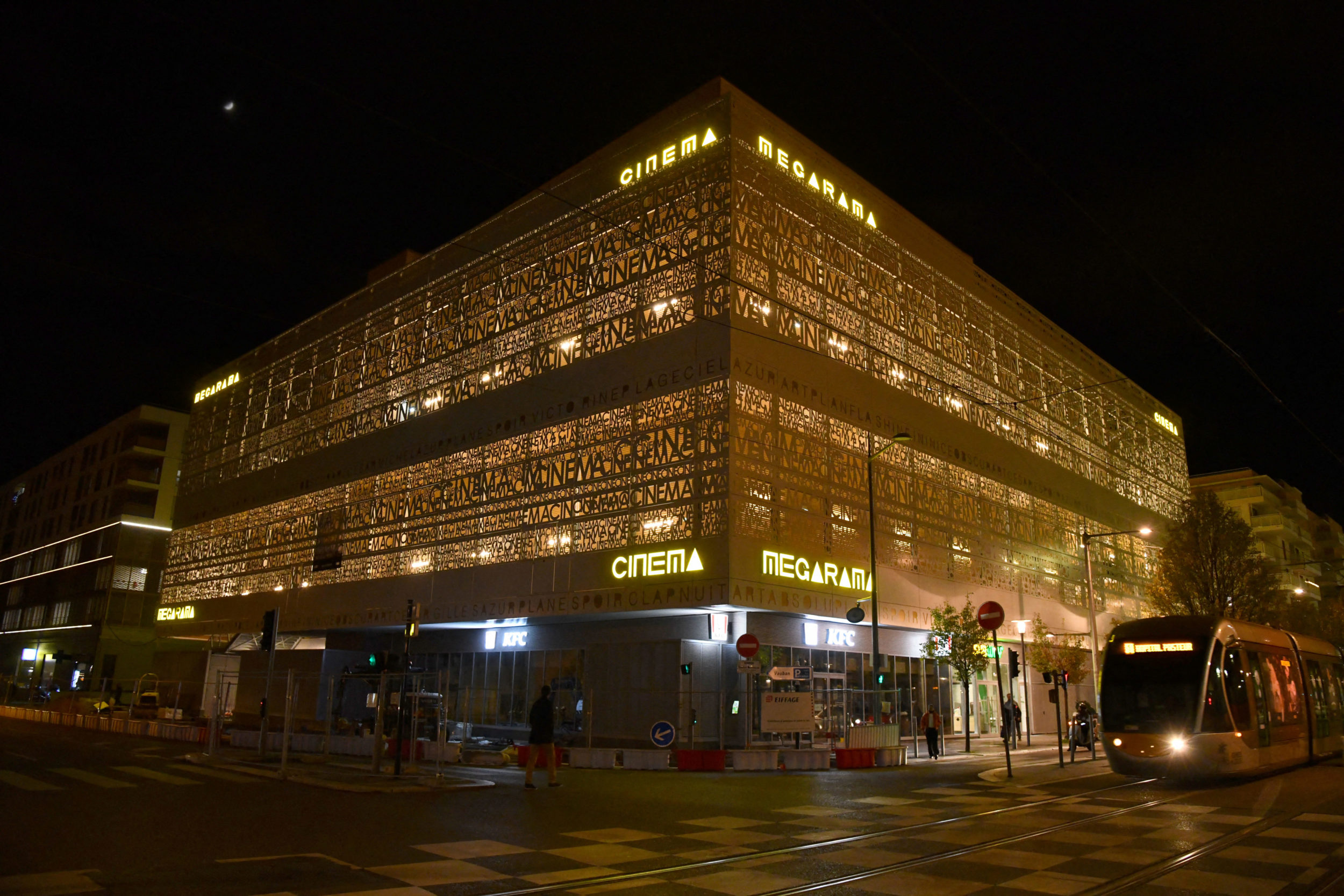 Il ne passe pas inaperçu dans le paysage niçois : érigé sur trois niveaux, le nouveau Megarama arbore une résille composée de panneaux en aluminium blanc laqué où s’affiche le mot « cinéma » dans plusieurs tailles ; de cet habillage dépassent les boîtes des salles dans un revêtement doré. C’est surtout dans l’obscurité que le bâtiment se révèle, les luminaires intérieurs traversant la résille pour faire scintiller l’ensemble, conçu par l’agence locale InSitu Benaïm-Nivaggioni Architectes. Le multiplexe est le fleuron du nouveau Carré Vauban, dans le quartier Saint-Jean-d’Angély, regroupant, via trois îlots, des logements, des commerces et un vaste parking aérien, le tout accolé au tramway pour rejoindre le centre de Nice.