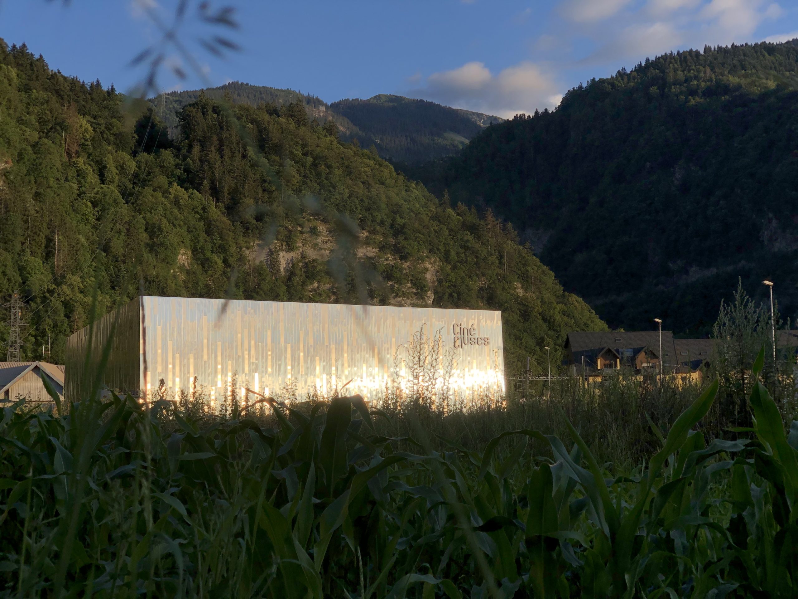 Avec une coque en inox aux lamelles alternativement lisses et brossées ainsi que deux pans vitrés, le bâtiment se fond dans le paysage et reflète les montagnes environnantes.