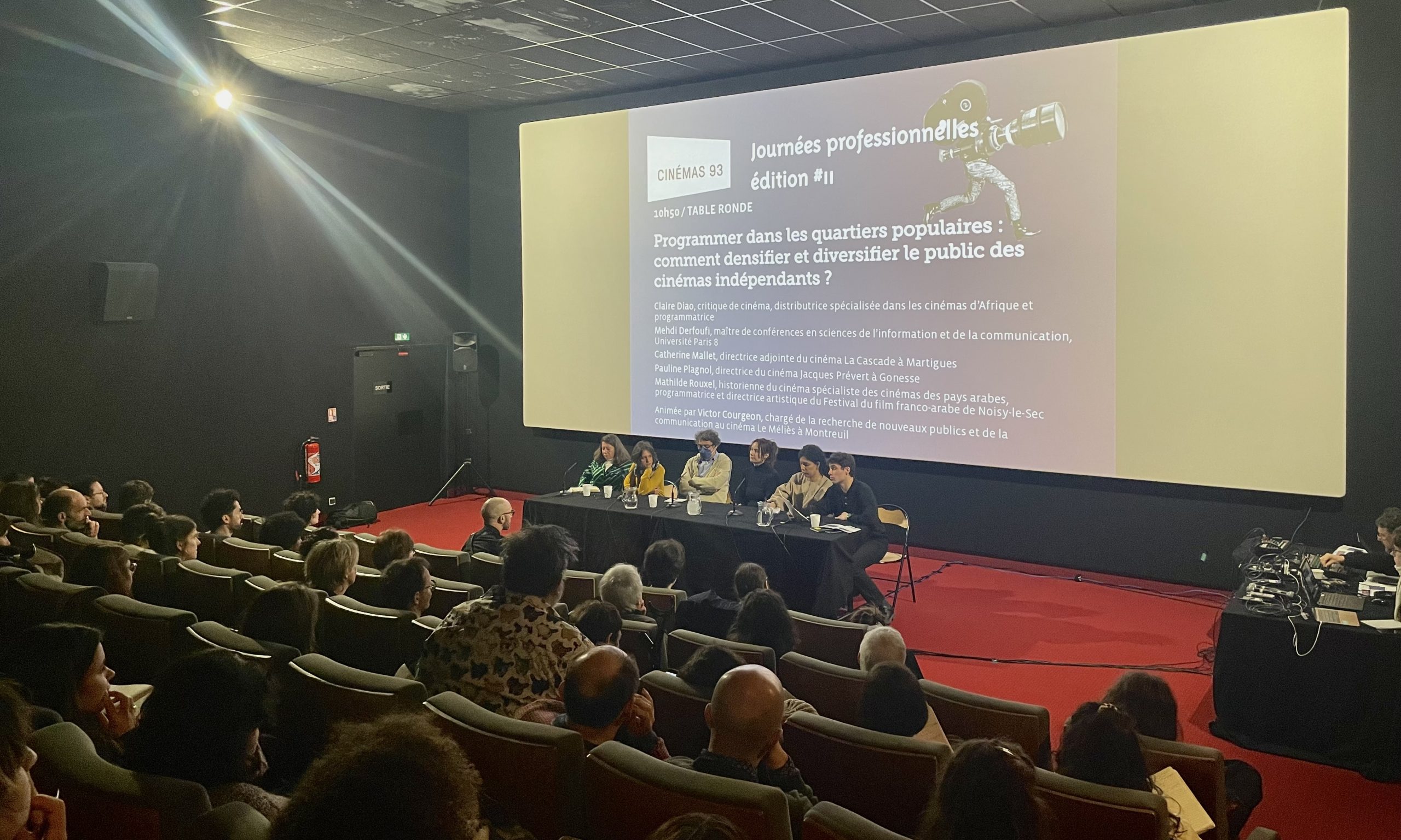 En ouverture, Vivien Soldé, docteur en sciences de l’éducation et de la formation, est brièvement revenu sur l’histoire des ciné-clubs dans la région et le rôle qu’ils ont assuré dans le paysage cinématographique : « Ce modèle, populaire dans l’après-guerre, s’articule en trois temps : une présentation du film, une projection et une discussion avec le réalisateur ou un spécialiste », rappelle-t-il, en prenant appui sur sa thèse et ses recherches dans le cadre du projet SAFO-93. Si jadis les exploitants observaient ce dispositif comme de la concurrence déloyale, ils tentent désormais de s’en inspirer dans leurs logiques de travail : « Nous essayons de proposer des programmations qui s’approchent de ces expériences-là, en assurant des présentations de films peu visibles. Et l’événement crée la rencontre », complète Mathilde Rouxel, programmatrice, co-directrice artistique du festival Aflam et directrice du festival du film franco-arabe de Noisy-le-Sec lors de la table ronde sur la programmation dans les quartiers populaires.